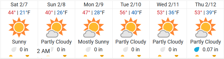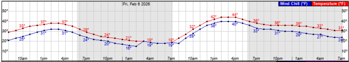 • Forecasted high of 44 degrees, with above freezing temps between 10am and 7pm Saturday.