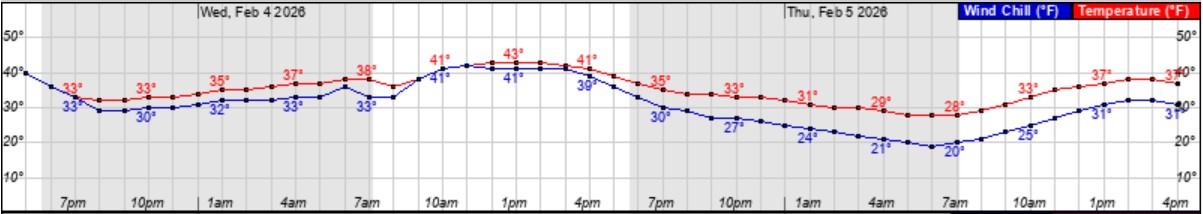 • Forecasted high of 38 degrees, with above freezing temps between 9am and 6pm.